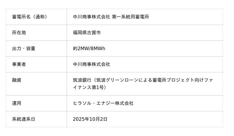 中川商事株式会社(本社:茨城県土浦市、代表取締役社長:中川 清、以下「中川商事」)は、「中川商事株式会社 第一系統用蓄電所(約2MW/8MWh)」にて系統用蓄電事業を開始したことをお知らせいたします。