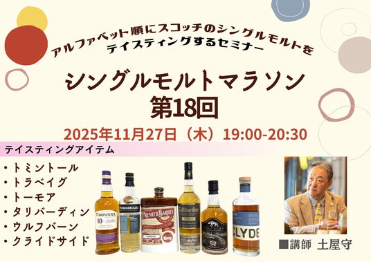 株式会社ウイスキー文化研究所(本社:東京都渋谷区、代表:土屋守)は、2025年11月27日(木)19:00から「完全版シングルモルトスコッチ大全」(小学館)をテキストに土屋守が各蒸留所の歴史や最新トレンドを解説し、その掲載ボトルをアルファベット順に飲むセミナーの第18回を開催します。お申し込みは弊社オンラインショップより開始しております。