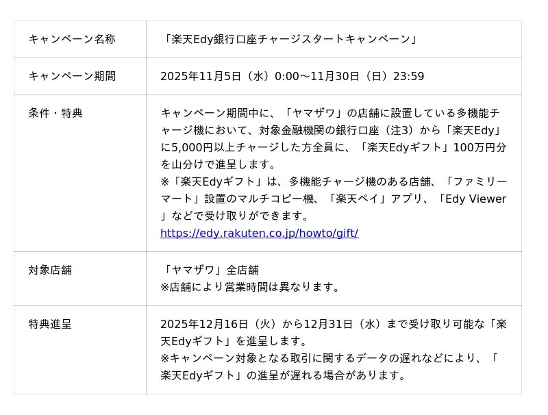 サービス開始を記念して、2025年11月5日(水)から11月30日(日)まで、「楽天Edy銀行口座チャージスタートキャンペーン」を実施します。