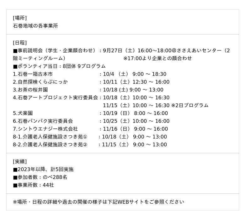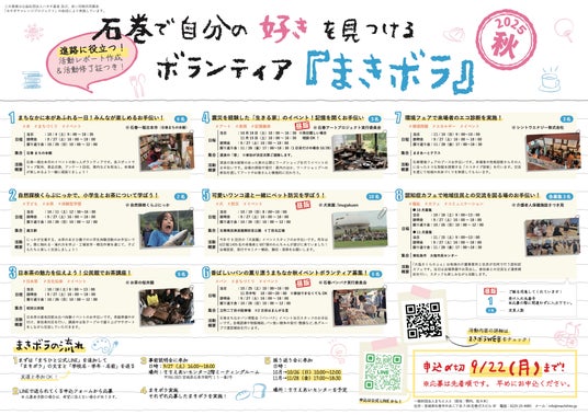 一般財団法人まちと人と(所在地:宮城県石巻市/代表理事:斉藤誠太郎)は、高校生・大学生が石巻地域で様々なボランティア体験を通じて、自分の興味関心を発見し、将来の可能性を広げるプログラム『まきボラ』を開催いたします。