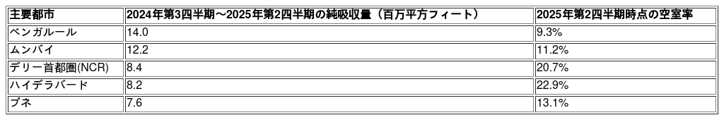 バンガロールやムンバイなどの都市が主導し、バンガロールだけで1年間に吸収したオフィススペースは、多くの欧州都市が5年間で吸収する量を上回りました。需要はグレードA+ビルに集中する傾向が強まっており、これらのビルでは賃料が5~10%高くなり、空室率が3~6%低くなっています。