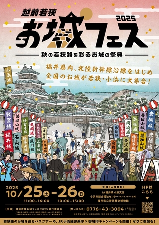 福井県内外のお城の魅力を発信するイベント「越前若狭お城フェス2025」が、2025年10月25日(土)、26日(日)に福井県小浜市で開催されます。福井県内をはじめ、北陸新幹線沿線地域や近隣府県など全国のお城関係団体が一同に会し、各城の魅力を紹介。石原良純さん、平山優さんら著名人による講演、ブース出展、体験講座などを通し、歴史ツーリズムの活性化を図ります。