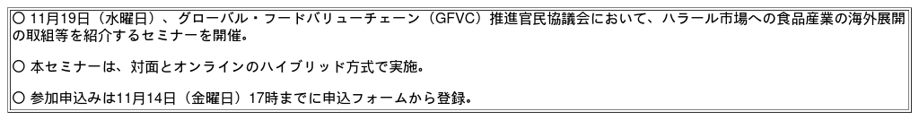 ハラール市場への食品産業の海外展開に関するセミナーを11月19日に開催します