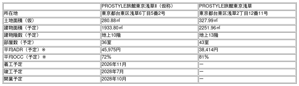 ※「PROSTYLE旅館東京浅草Ⅱ(仮称)」に関するこれらの見通しは、過去の実績および経営陣の想定に基づいております。実際の結果は大きく異なる可能性があり、ここに記載された目標が達成されることを保証するものではありません。