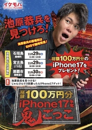 沖縄の各地の開催場所にいる「イケモバ社長・池原恭兵」を見つけ出し、じゃんけんで3回連続で勝った方に、最新のiPhone17をプレゼント!