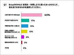 契約理由では「工事不要ですぐ使える」が最も多く、外出先での利用や料金面の手軽さも支持されています。暮らしの変化に合わせて柔軟に使える点が、Broad WiMAXが選ばれる大きな要因となっています。