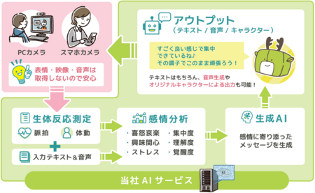 ロジカ式の共感AIは、PCやスマートフォンのカメラから取得した脈拍・体動などの生体データを解析し、ユーザーの集中・没頭・ストレス・無関心といった状態をリアルタイムに推定します。その感情情報と、学習状況などの入力情報を組み合わせて基盤モデル(大規模言語モデル等)に入力する「モデル入力情報(プロンプト)」を生成し、非認知能力を高める共感的なメッセージやアドバイスを自動生成します。