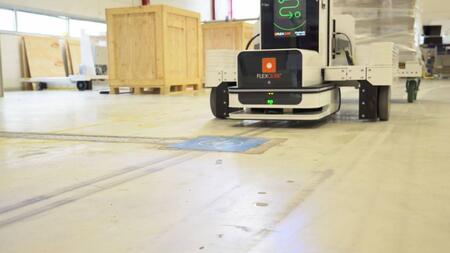 ダイムラー・ラック社の同拠点では、FlexQube社のAMRが約250メートルの走行ルートを通じてエンジン・トランスミッションラインへ部品を供給しています。しかし、従来のAMR運用には、個別の充電ステーションに戻る際のダウンタイム発生やそれらステーションが工場内の貴重な床面積を占有するなど、生産性と柔軟性を損なう課題が存在していました。
