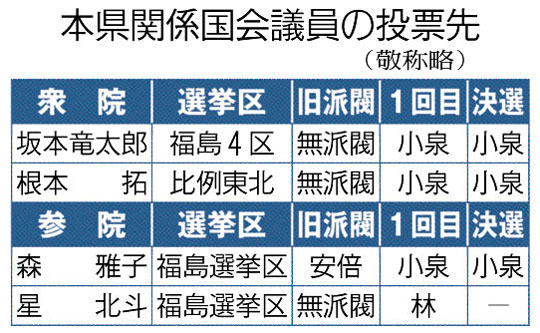 3人は森雅子参院議員(福島選挙区)と坂本竜太郎衆院議員(福島4区)、根本拓衆院議員(比例東北)。いずれも1回目の投票でも小泉氏を支持した。