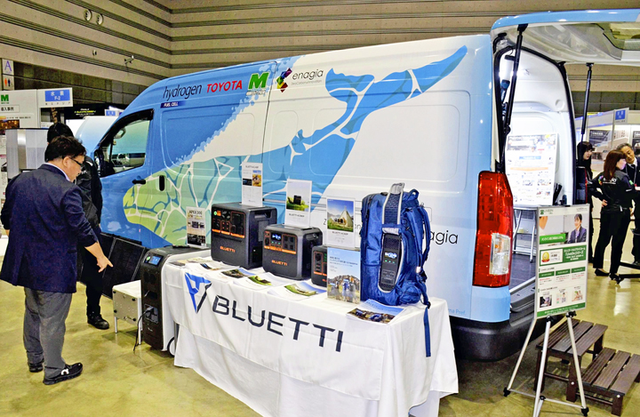 このうち再エネの利活用を進めるエナジア(郡山市)は、新エネルギー・産業技術総合開発機構(NEDO)の実証実験の一環として開発した水素自動車を展示。水素自動車を電源として、災害時に行政の事務所として利用できる遠隔支援窓口の機能を紹介している。