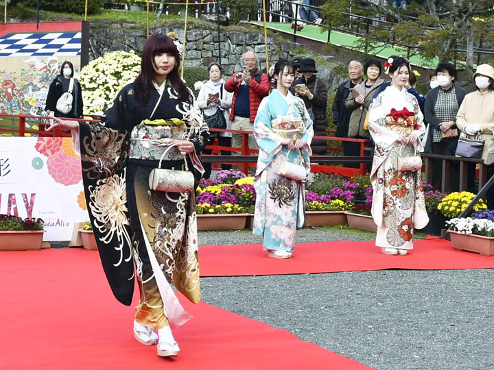 第69回「二本松の菊人形」スペシャルランウェイは3日、福島県二本松市の霞ケ城公園で開かれた。福島美少女図鑑のモデル7人が出演し、菊があしらわれた豪華絢爛(けんらん)な振り袖をまとい、ランウェイを歩いて会場を彩った。