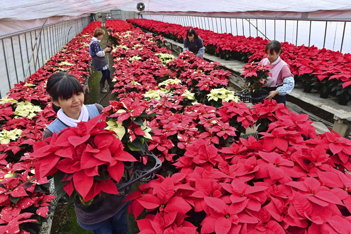 出荷の最盛期を迎えた色鮮やかなポインセチア=矢祭町・ふるいち園芸 福島県矢祭町で、クリスマスシーズンを鮮やかに彩るポインセチアの出荷が最盛期を迎えている。 同町のふるいち園芸では、ビニールハウスを日中約24度、夜間18度に温度管理して栽培している。 人気の赤色のほか白や黄色、バラ咲きなど10色20種類、約2万3000鉢を出荷する予定。古市利夫代表(66)は「穏やかな気持ちで、クリスマスを迎えてもらえたら」と話した。作業は12月中旬まで続く。 #写真ニュース #花 この記事をSNSで伝える: