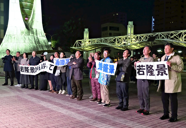 大相撲九州場所千秋楽の23日、福島市のJR福島駅西口駅前広場でパブリックビューイング(PV)が行われ、市民らが同市出身の若元春、若隆景に大きな声援を送った。