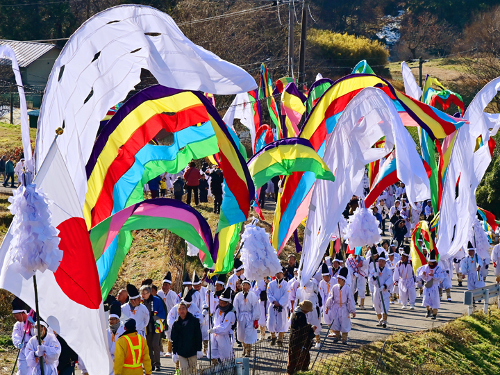 日本三大旗祭りの一つで、970年余りの伝統を誇る国指定重要無形民俗文化財「木幡の幡(はた)祭り」は7日、二本松市木幡地区で行われた。氏子衆が色とりどりの五反幡(旗)をなびかせ、冬の山里を練り歩いた。