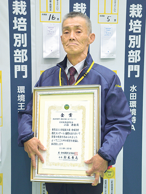 茨城県つくばみらい市で開催中のコメ品評会「第27回米・食味分析鑑定コンクール国際大会」は最終日の7日、栽培別などの部門の審査が行われた。「環境王国」認定市町村から選ばれる栽培別・環境王国部門で小沼孝雄さん(天栄米栽培研究会)が金賞を受けた。
