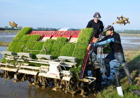 秋田県大潟村では16日、快晴の下で水が張られた1区画2・5ヘクタールの田んぼの中を田植え機がゆっくりと進み苗を植えていた。村内で約100ヘクタールを扱う企業「大潟村あきたこまち生産者協会」では、5月上旬から田植えを開始。早朝から夕方まで作業し、2週間ほどで植え終えるという。