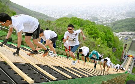1972年の冬季五輪でスキージャンプ会場となった札幌市の大倉山ジャンプ競技場で17日、最大傾斜37度、標高差約130メートルのラージヒルを駆け上がるレースが開かれた。男・女の個人種目と4人一組のリレーがあり、計1700人超が約400メートルの急坂に挑んだ。