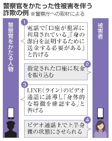 警察官をかたり捜査名目で金銭を送らせる特殊詐欺が今年1~3月、2千件近く確認され、20~30代の被害が急増している。性被害を伴うケースも起きており、通信アプリのビデオ通話を介して裸にさせられたり、「24時間監視が必要」と入浴中の映像を送らされたりするなど、各地で女性6人の被害が確認された。警察庁が注意を呼びかけている。