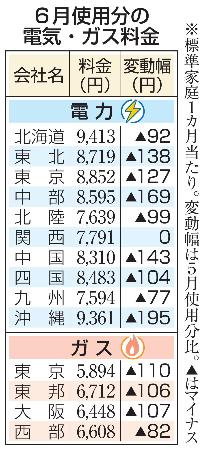 大手電力10社が29日発表した6月使用分(7月請求)の標準家庭向け料金によると、横ばいの関西を除く9社で値下がりする。火力発電の燃料となる石炭や液化天然ガス(LNG)の輸入価格が下がったためで、値下がり幅は77~195円。都市ガス4社も原料価格の下落により82~110円安くなる。