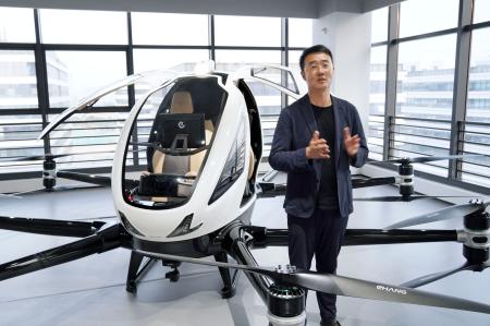 広東省広州市にあるドローンメーカー「億航智能」の開発現場。2人搭乗可能な空飛ぶクルマが低い音を立てて地上数十mまで上昇し、あっという間に視界から消えた。安定した飛行ぶりに見学者から感嘆の声が漏れた。