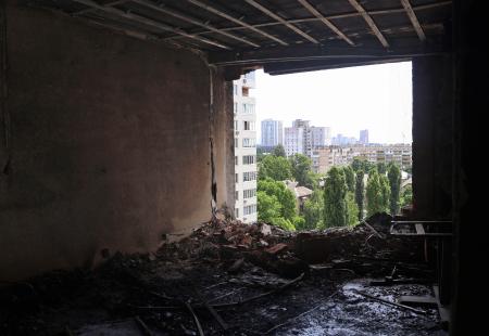 11階の部屋は外壁が壊れ、天井が剥がれ落ち、焦げた臭いが充満していた。「ボンという大きな爆発音がし、隣室で火災が起きた。玄関が開かず避難できなかった」。マキシムさん(45)が片付けに追われながら話した。