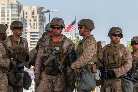 【ロサンゼルス共同】照準器付きのライフル銃を手にした兵士たちが鋭い眼光を光らせた。13日、不法移民摘発を巡る抗議デモに対応するため、海兵隊が初展開した西部ロサンゼルスの連邦庁舎前。数時間で集まったデモ参加者はわずか数人だった。「さらなる混乱を招くだけだ」。軍投入の必要性を疑問視する声が上がった。