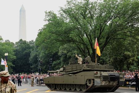 曇り空の下、気温は30度近くまで上昇。ホワイトハウスの南側に位置する大通りを、歴代の軍服姿や迷彩服姿の陸軍兵が行進した。装甲車や「世界最強」の戦車エーブラムスが姿を見せると沿道の観客から大歓声が上がった。
