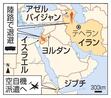 外務省によると、在留邦人はイスラエルに約千人、イランに約280人いる。退避のため日本政府が用意したバスが、イスラエル中部テルアビブから隣国ヨルダン、イラン首都テヘランから隣国アゼルバイジャンにそれぞれ向かった。