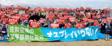 7月に予定されている陸上自衛隊の輸送機V22オスプレイの佐賀空港(佐賀市)配備計画に反対する市民団体は21日、空港周辺で抗議集会を開き、約600人(主催者発表)が「オスプレイ来るな」と声を上げた。集会後は、空港に隣接する佐賀駐屯地(仮称)沿いをデモ行進した。
