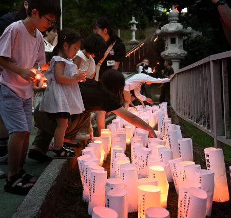 太平洋戦争末期、旧海軍鹿屋航空基地(現海上自衛隊鹿屋航空基地)から出撃し、戦死した特攻隊員を悼む集いが21日夜、鹿児島県鹿屋市で開かれた。市によると、基地では全国最多の908人が帰らぬ人となった。県内外の遺族らが発光ダイオード(LED)の灯籠に明かりをともし、思いをはせた。