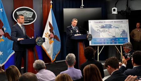 【ワシントン共同】ヘグセス米国防長官らは22日、国防総省で記者会見し、イラン核施設攻撃について説明した。作戦名は「真夜中の鉄つい」だと表明。「初期の分析では全てが標的に命中し、期待通りの影響を与えた」と述べ「圧倒的な成功」だったと強調した。大型の特殊貫通弾を初めて実戦で使ったと明らかにし「イランの核の野望を打ち砕いた」とした。