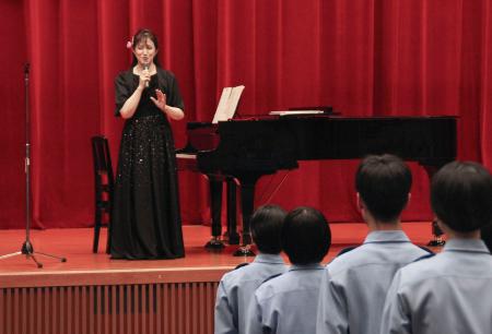 歌を通じて集団の和と一体感をつくるため、警視庁は23日、ソプラノ歌手稲見里恵さんを東京都府中市の警察学校に招き、7月に卒業予定の初任科生らに、息の吐き方など歌唱指導を実施した。