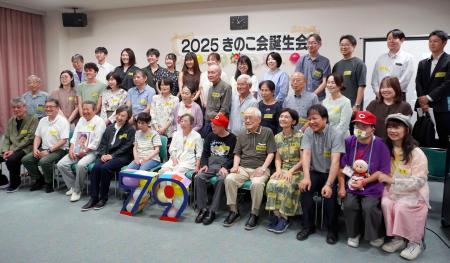 1945年の広島、長崎への原爆投下時に母親の胎内で強力な放射線を浴び、脳や体に障害がある「原爆小頭症」の被爆者と家族らでつくる「きのこ会」が28日、広島市内で誕生会を開き、小頭症の当事者が79歳を迎えたことを祝った。