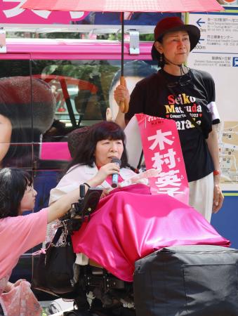 「障害者の声を閉ざさない政治を皆さんと一緒に実現したい」。れいわ新選組から比例代表で立候補した木村英子氏(60)は、東京都多摩市の京王聖蹟桜ケ丘駅前で第一声。「再び私を国会に送り出してください」と訴えた。