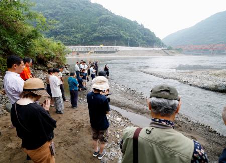 隣接する八代市を流れる球磨川の河川敷では、氾濫が起きた早朝に合わせて、住民ら約30人が地元の風習にならい「安穏なれ」「一日も早い復興を」などと願いを書いた石を川に投げ入れた。行事を企画した道野紗喜子さん(46)は知人ら4人を水害で失ったといい、「将来の災害に備えるため、風化はさせたくない」と話した。