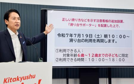 北九州市八幡東区の皿倉山に市が設置し、けが人が相次いだため利用を停止した滑り台について、武内和久市長は10日の定例記者会見で、夏休みの始まりに合わせ、19日から利用を再開すると明らかにした。6~12歳に限る。安全確保のために市職員を置き、正しい使い方を記した看板を増やす。