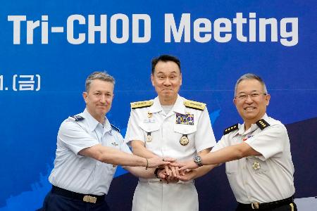【ソウル共同】日米韓3カ国の制服組トップが協力の方策などを話し合う「日米韓参謀総長等会議」が11日、ソウルで開かれた。北朝鮮の核・ミサイル開発やロシアとの軍事協力を批判し、日米韓の防衛協力を維持、深化させる方針を確認する共同声明を発表した。同会議の韓国開催は初。吉田圭秀統合幕僚長と米軍のダン・ケイン統合参謀本部議長、韓国軍の金明秀合同参謀本部議長が参加した。