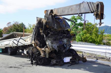 事故は14日午後0時半ごろ発生。トラック運転手とバスの乗客計2人が死亡し、バスの運転手(39)と乗客の計12人が重軽傷を負った。県警は15日、自動車運転処罰法違反(過失致死傷)容疑でトラックを所有する愛媛県四国中央市の建設会社を家宅捜索した。