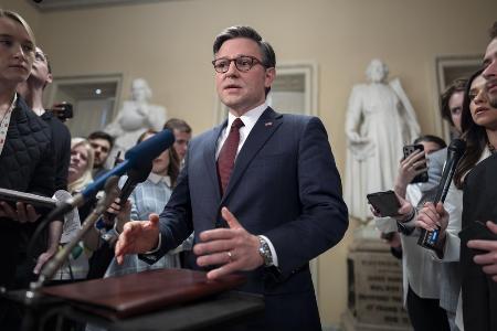 報道陣に向かって話すジョンソン米下院議長=2024年4月、ワシントン(AP=共同)