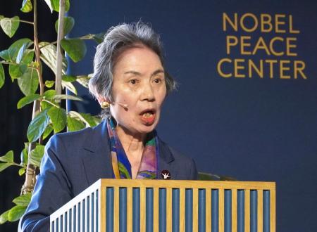 【オスロ共同】昨年ノーベル平和賞を受賞した日本原水爆被害者団体協議会(被団協)の和田征子事務局次長(81)は6日、ノーベル平和センターが被爆80年に合わせてノルウェー・オスロで主催した平和会議で講演した。核兵器保有国とその同盟国は「自らの不誠実さと傲慢さで、人類が核戦争の瀬戸際に立たされている事実を認識するべきだ」と訴えた。