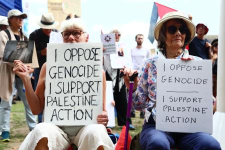 ロンドン中心部の議会議事堂前広場で行われた9日のデモでは、参加者らが「大量虐殺に反対し、パレスチナアクションを支持する」と書かれたプラカードを掲げて抗議した。ロンドン警視庁によると、逮捕者の一部は同団体を支持する活動に今後参加しないとの条件で同日釈放された。