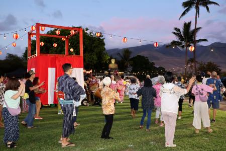 日系人が多いハワイでは盆踊りが定着し、火事前は三つの寺がそれぞれ実施。今回、合同の会場となったラハイナ浄土院の跡地には千数百人が訪れた。火事を逃れた大仏像前の櫓を参加者が囲み、和太鼓の音に合わせ踊った。