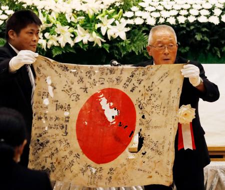 第2次大戦に従軍した米兵が戦地から持ち帰った日章旗が、現在の北海道当麻町から出征した日本兵3人のうちいずれかのものだと判明し、13日に開かれた町の戦没者追悼式で返還された。受け取った町戦没者遺族会会長の菅田信博さん(87)は、旗に記された40人の署名から父のいとこを見つけたといい「世界中で戦争は起きている。若い人に見てもらいたい」と話した。
