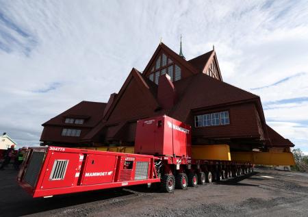 今回移転するキルナ教会は1912年に建設され、幅約40メートル、重さ600トン以上。トレーラーで約5キロ離れた場所まで搬送する。移動ルートの道路は事前に拡幅工事をした。