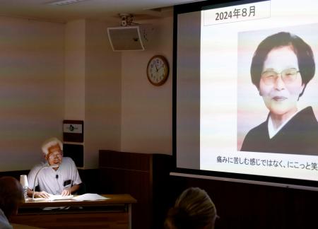 勇成さんは、昨年8月に93歳で亡くなったキミ子さんの写真を示しながら説明。40歳ごろに症状が現れてから50年以上、夜に何度も目覚めてしまうほどの腰やひざの痛みに苦しんでいたと明かした。一方で、地域の集まりや農作業を通じ、笑顔で楽しく生きようとしていたと振り返った。