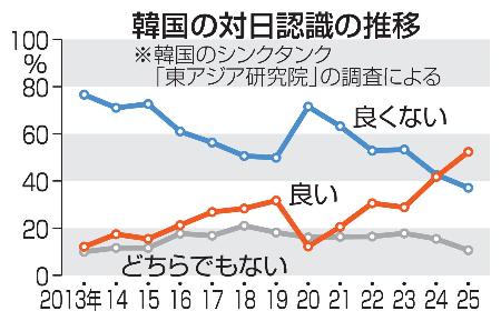 石破茂首相への印象は「良い」も「悪い」も32・5%。東アジア研究院の調査で、日本の首相で最も好感度が高いという。韓国では、石破氏は過去に自身のブログで戦争責任に触れているなどと報じられ、比較的好意的な受け止めがある。