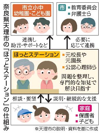 奈良県天理市が昨年4月に開設した「ほっとステーション」は、元校長や公認心理師らが保護者の相談や要望に一元的に対応。保護者と学校の間に立った解決を目指し、学校現場を訪問することも多い。今年7月末時点までに727件の相談があった。