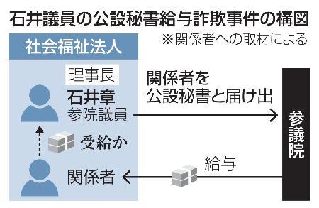 石井章参院議員(68)=日本維新の会除名=の公設秘書給与詐欺事件で、石井氏が、勤務させるつもりがないにもかかわらず、自身が理事長を務める社会福祉法人の関係者を公設秘書として国に届け出ていた疑いがあることが30日、関係者への取材で分かった。他にも勤務実態のない公設秘書がいたとみられることも判明。東京地検特捜部は押収した資料の分析や、事務所関係者への聴取を進めている。