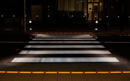 「埋込型信号」が設置された守口市の横断歩道。道路は片側1車線で、頻繁に車が行き交う。道路を照らすのは、横断歩道近くに立てられた4本のポールや、横断歩道の手前や両脇に埋め込まれたLED。開発、提供をしている「アトラス埋込型信号機」によると、目線が下がりやすい高齢者や子どもへの注意喚起が期待できる。