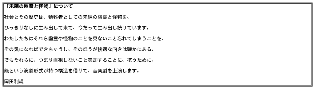 国際的に活躍する演劇作家である岡田が、目に見えないもの、霊的な存在がその思いを語る「夢幻能」の構造を借りて紡ぎ出す音楽劇、待望の第二弾!